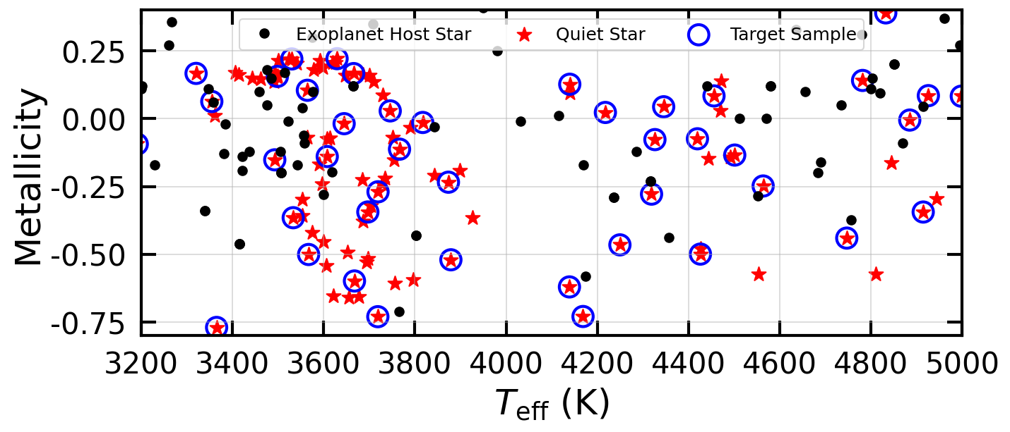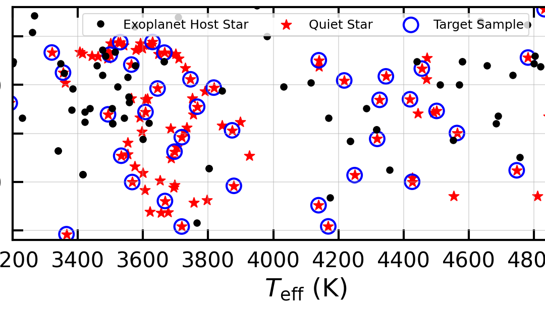 Overlap of quiescent K and M dwarfs (red stars) with transiting exoplanet hosts (black dots) in stellar Teff and metallicity space. The range of targets selected for this proposal (blue circled red stars) allows for broad expansion and testing of model atmospheres in this parameter space.